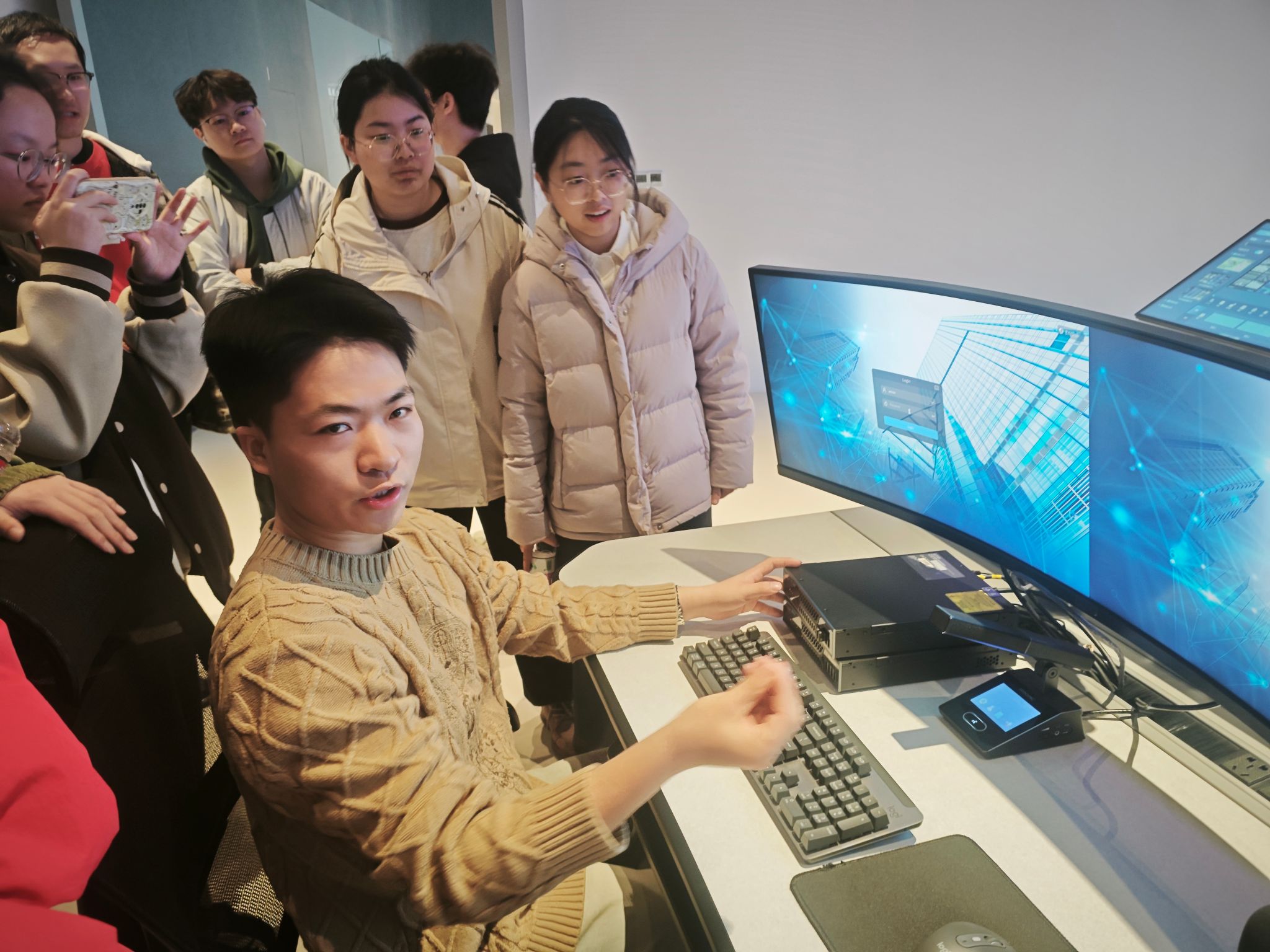诺瓦星云工作人员对西电师生的到来表示热烈欢迎。师生一行首先参观了诺瓦星云的展厅。这里犹如一个科技的奇幻世界,各类前沿的显示控制产品琳琅满目,从微小间距的LED显示屏解决方案、无纸化会议解决方案到大型体育赛事、公司会议、舞台演出所使用的高端大型显示设备,每一件展品都凝聚着诺瓦星云在光电显示等技术领域的创新智慧。通过详细讲解,同学们直观感受到了诺瓦星云相关产品的先进性与多样性,对电子信息领域专业知识在实际产品中的广泛应用有了清晰的认知。