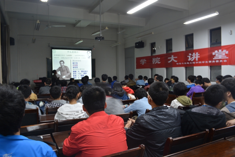 报告会上,朱教授以“神奇的飞秒激光”为主题,在历时一个多小时的讲座中,将大家带入奇幻的科技世界。整个讲座从“什么是激光”,“激光的特点与应用”切入,讲述了飞秒激光的概念、发展及前景等几个方面,并通过各种实例让同学们真切的感受到了飞秒激光的的独特魅力。尤其当讲到飞秒激光的各种神奇应用时,现场同学一阵惊叹。此外,朱教授还给同学们介绍了激光专业极其就业方向,并简单介绍了我国目前在这一领域所取得的成就。讲座的最后,他鼓励同学们投身祖国飞秒激光的研究中,为科学奉献,为祖国争光!