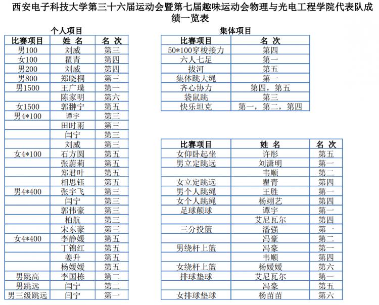 周日一早,天气晴朗,在本次运动会的开幕式上,我院方阵以整齐的队伍,嘹亮的口号,新颖的造型设计,得到了全场观众的掌声和好评。在接下来的比赛中,我院运动健儿奋勇争先,完美地展现了学院进取顽强的拼搏精神。在短跑、长跑、跳高等个人项目中不畏强手,尽情展示,生动的诠释了“更高、更快、更强”的体育精神。在集体跳绳、六人七足、快乐坦克等集体项目中,同学们齐心协力,通力合作以优异的成绩摘取桂冠。尤其是快乐坦克项目,我院选报的三支队伍分别活动该项比赛的一、二、四名次,反映了认真的训练态度和扎实的训练成效。比赛中,我院的加油助威声此起彼伏,“物理与yl23455永利集团”的名字通过主席台的广播不时在场上回响,最终我院囊括了多个比赛项目的冠军,团体总分第三名,与第二名仅仅相差九分。
