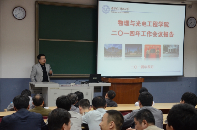 4月9日晚上7:30,物理与yl23455永利集团在北校区阶教308召开2014年学院工作会议,执行院长郭立新代表学院党政领导班子进行工作报告,全面总结了2013年学院的工作,安排部署学院2014年具体工作。会议由杨光暐主持。