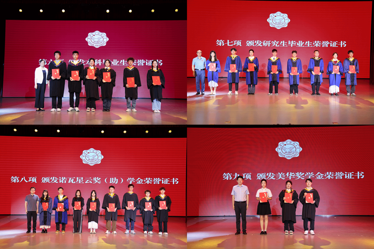 表彰环节,副院长辛红、副处级组织员黄小强分别为2025届优秀本科、研究生毕业生颁发荣誉证书,西安诺瓦星云中研院实验室主任、2008级校友林先萌、学校校友事务与对外合作处副处长兼对外战略合作办公室主任曹立砥分别为获得2023-2024学年诺瓦星云奖(助)学金、美华奖学金及其提名奖的学生代表颁发荣誉证书并合影留念,对获奖同学表示祝贺。