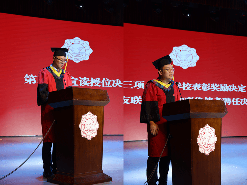 在师长的祝福视频与庄严的国歌声中,学院2025届毕业典礼暨学位授予仪式正式开始。副院长秦翰林、孙浩分别宣读了学校2025届毕业生学位授予决议及表彰优秀毕业生、聘任校友联络大使与使者的决定,祝贺毕业生顺利完成学业、即将开启人生新征程。