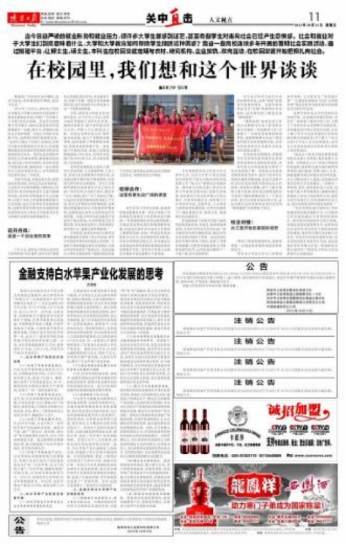 当今日趋严峻的就业形势和就业压力,使许多大学生都感到迷茫,甚至有些学生对走向社会已经产生恐惧感。社会和就业对于大学生们到底意味着什么,大学和大学教育如何帮助学生摆脱这种困惑?我省一些高校连续多年开展的暑期社会实践活动,通过搭建平台,让博士生、硕士生、本科生在校园里就定期与农村、研究机构、企业接轨,双向互动,在校园里就开始把根扎向社会。