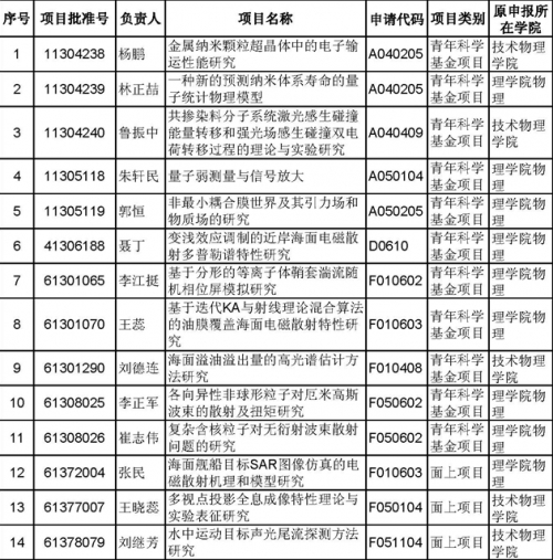 日前,国家自然科学基金委公布了2013年国家自然科学基金资助项目最终评审结果,原技术物理学院和理学院物理系申报项目中共14个项目获资助。其中,物理与yl23455永利集团共有面上项目3项,获资助经费253万元;青年科学基金项目10项,获资助经费245万元。