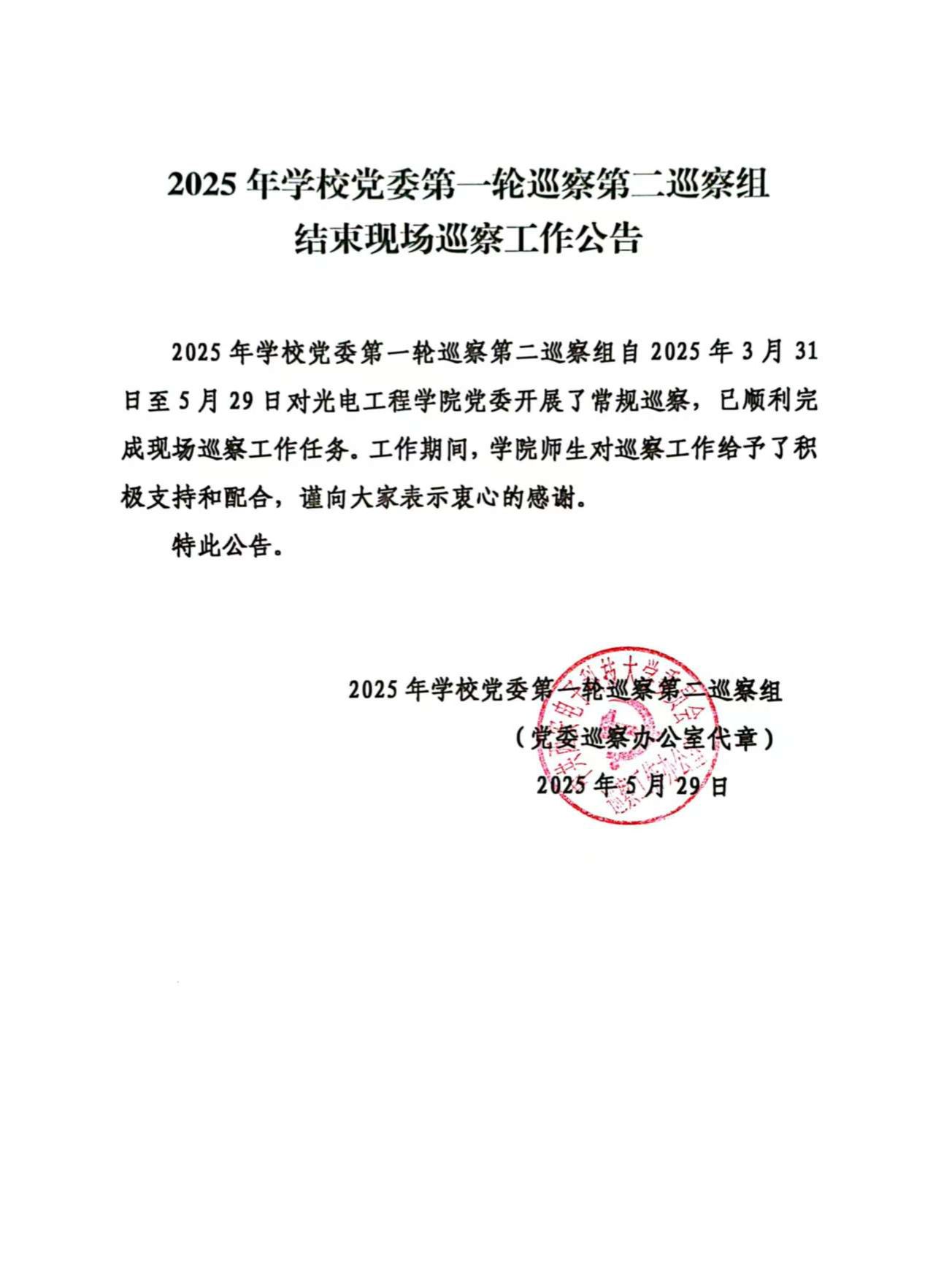 2025年学校党委第一轮巡察第二巡察组结束现场巡察工作公告