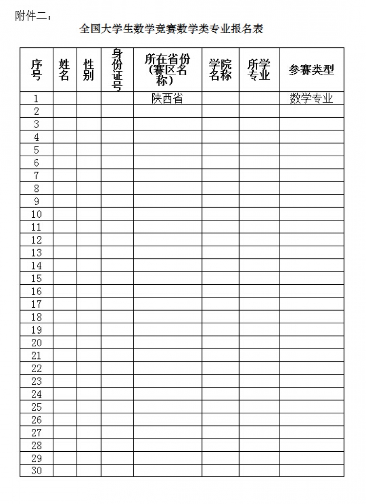 附件二:全国大学生数学竞赛数学类专业报名表