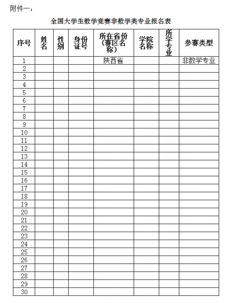 附件一:全国大学生数学竞赛非数学类专业报名表