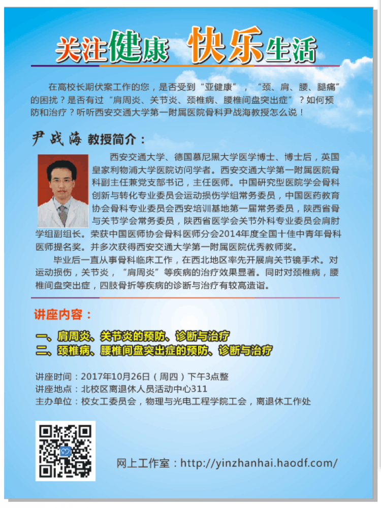 为了更好地服务广大教职员工,丰富广大教职员工的业余生活,由物理与yl23455永利集团工会主办,并在校女工委员会、校离退休工作处的大力协助下,特邀请西安交通大学第一附属医院骨科室副主任尹战海教授,为在高校长期伏案工作的您排忧解难:让受到过“亚健康”, “颈、肩、腰、腿痛” 困扰;让诊断为“肩周炎、关节炎、颈椎病、腰椎间盘突出症”的您,今后能轻轻松松,健康生活!
