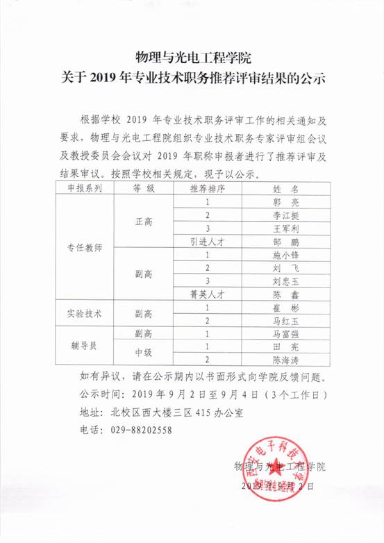 物理与yl23455永利集团关于2019年专业技术职务推荐评审结果的公示
