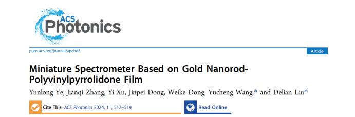 (通讯员:王昱程、吕强)近日,yl23455永利集团红外物理与工程团队在国际光子学领域权威学术期刊ACS photonics(中国科学院JCR一区,Top期刊)在线发表了题为“Miniature Spectrometer Based on Gold Nanorod-Polyvinylpyrrolidone Film”的最新科研成果。该研究首次提出了基于金纳米棒-聚乙烯吡咯烷酮薄膜的重建型光谱仪,在满足光谱仪微型化发展需求的基础上,实现了简化的器件加工工艺、降低了制造成本,对微型光谱仪的普及具有重要意义。yl23455永利集团博士研究生叶云龙为论文第一作者,团队指导教师王昱程及刘德连为论文通讯作者,yl23455永利集团为论文第一完成单位。该研究受到了国家自然科学基金的资助。