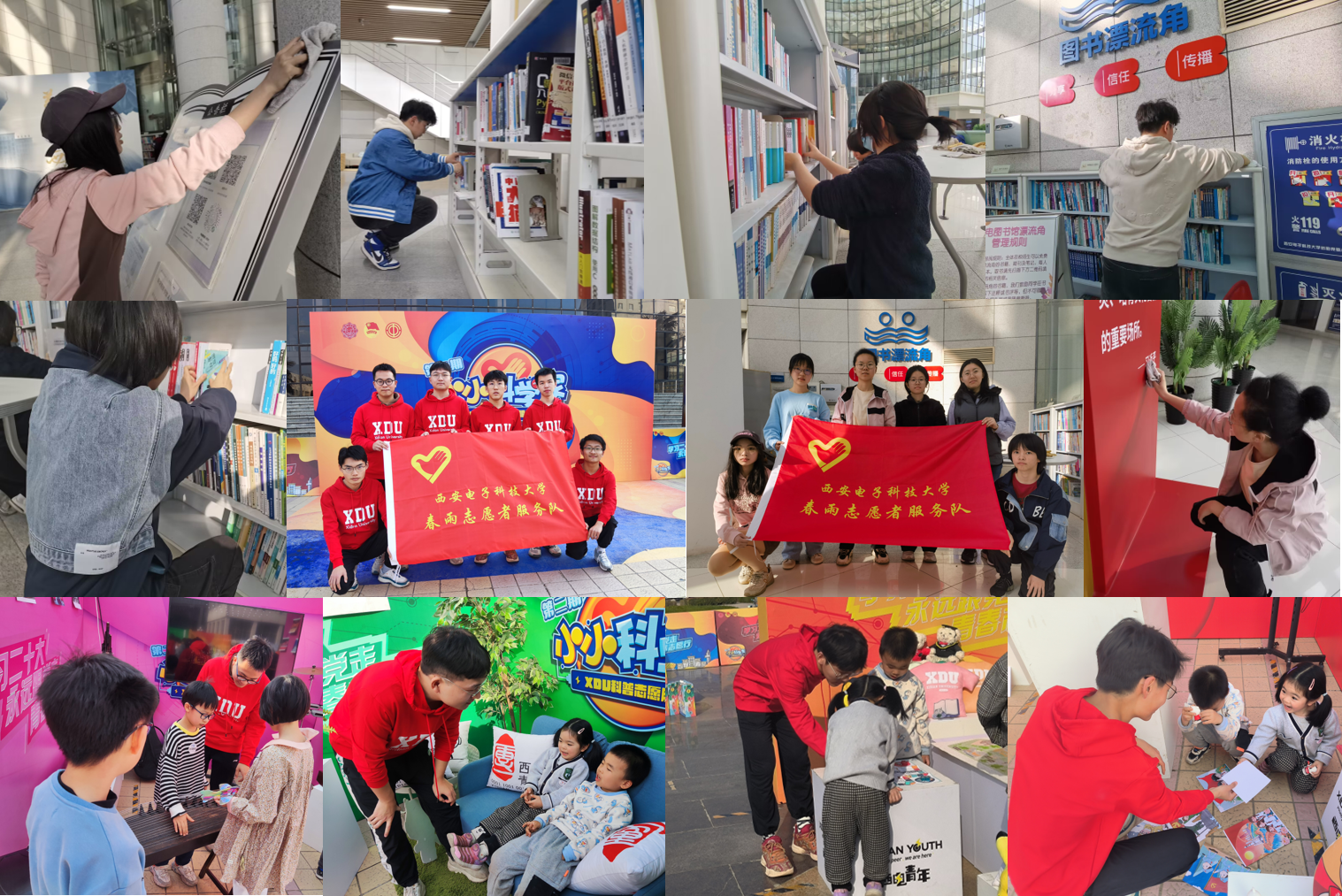 为使雷锋精神的学习走深走实,yl23455永利集团春雨志愿服务队招募组织学生志愿者参与校园志愿服务活动。在南校区图书馆,志愿者们分门别类地整理图书、细心细致的清理书架和打扫卫生,为读者顺利找到书籍提供便利,让读者在整洁的环境中愉快地阅读。在北校区“小小科学家”志愿服务的现场,志愿者们承担红色筑梦、科技创新等六个展区的导览工作,为前来参观的小朋友讲解各个展区的特色科创作品。