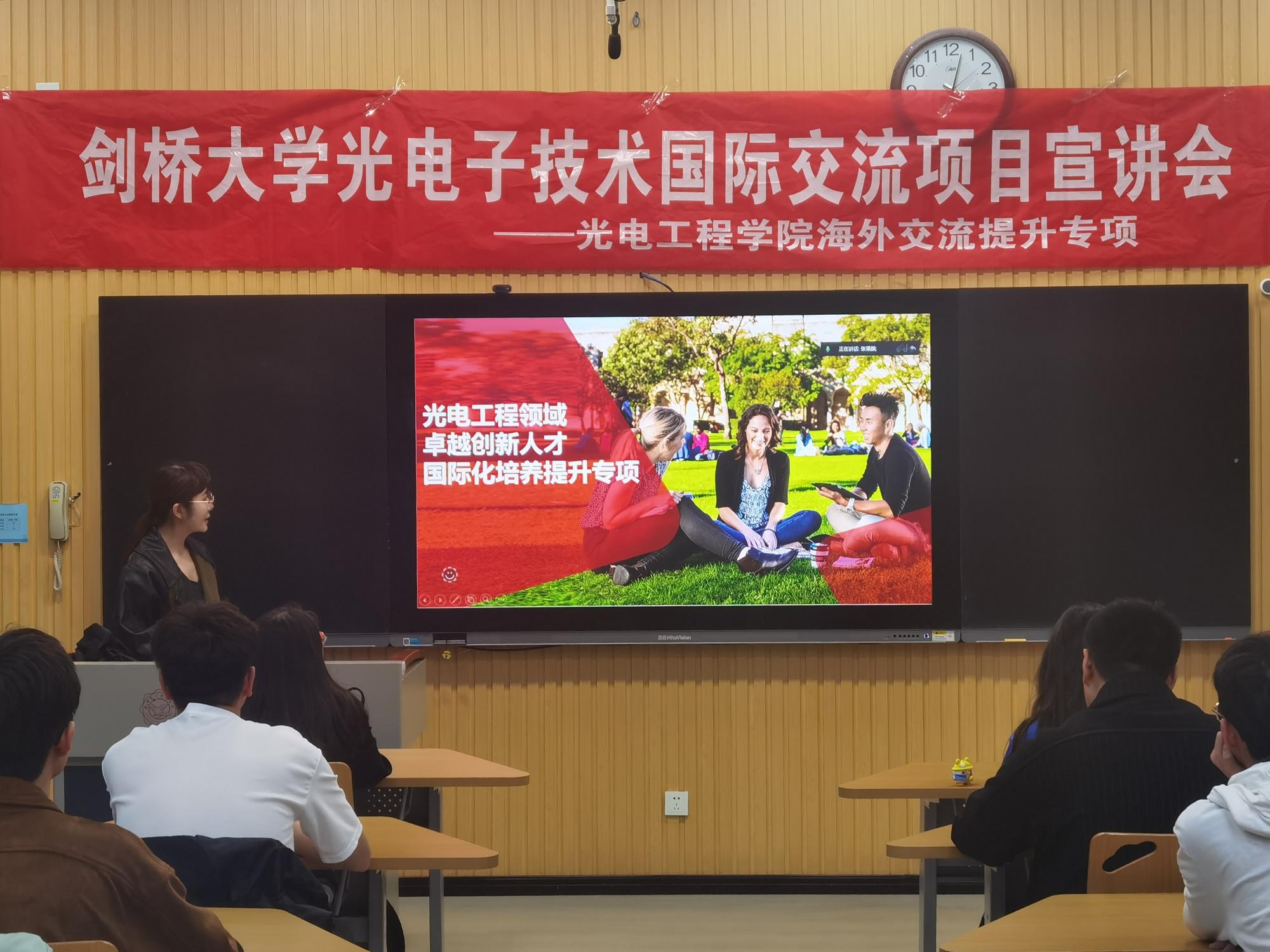 (通讯员:王纲、马力、李佳铭、姜萌)4月28日,yl23455永利集团在南校区C131教室顺利召开剑桥大学光电子技术暑期访学项目宣讲会,全美国际教育协会殷汝姗老师,电子科学与技术卓越班负责人来志老师同线上线下近50位本科生共同参加项目宣讲会。宣讲会由学院外事干事王纲主持。