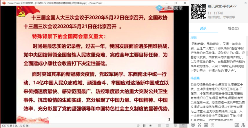 在授课互动环节,同学们纷纷发表了自己的学习感想。王好千同学说道:政府工作报告中提出了“一切从实际出发,立足办好自己的事”的要求。作为当代大学生,要认真学习领会两会精神,并把两会精神贯彻到实际的学习工作中,筑牢党性、树好形象、做出成绩。王潇帆同学表示:一封封按满手印的请战书上,写着“我是党员”“主动请战”等字样。在医院救死扶伤阵地上,党员医务工作者们,不畏艰险,不怕牺牲,用自己的行动践行共产党人的初心和使命,充分起到先锋模范作用。