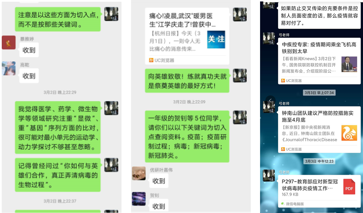 学院研究生导师、研工干部、研究生学生干部三个管理主体共抓全体研究生每日疫情防控信息采集、处理工作,形成疫情防控信息“冗余”机制,教职工党员在参与学生防控信息管理的过程中也达到了自我督促的效果。研究生导师充与研工干部充分沟通,全面掌握学生思想动态,关注热点舆情,在专业课程中穿插时事热评、政策宣传、防疫知识,强化特殊时期的课程思政、课堂育人、科研育人。