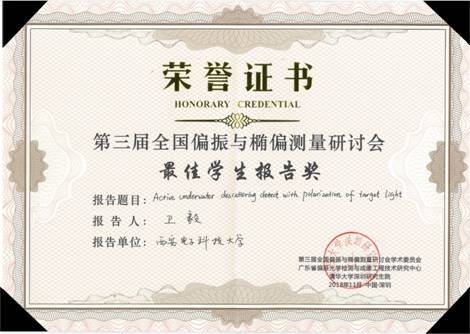 2018年11月11日至13日,我院青年教师刘飞博士及学生卫毅受邀参加清华大学深圳研究生院在深圳举办的第三届全国偏振与椭偏测量研讨会(简称CNPE2018)。并在大会期间做题为“水下偏振成像技术”的学术报告。参会人员合影刘飞博士在其报告中介绍了水下偏振成像技术及其应用前景,重点为高浑浊度水体中的水下主动偏振成像技术,利用波长选择原理降低水体散射对成像的影响,同时基于光学相关原理,有效利用水下场景信息的双域...